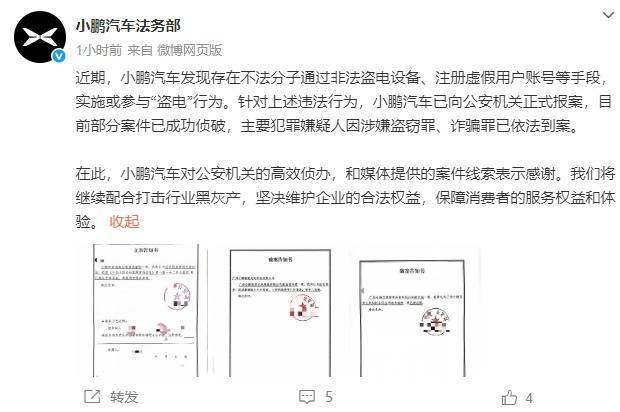 近期,小鹏汽车发现存在不法分子通过非法盗电设备、注册虚假用户账号等手段,实施或参与“盗电”行为。针对上述违法行为,小鹏汽车已向公安机关正式报案,目前部分案件已成功侦破,主要犯罪嫌疑人因涉嫌盗窃罪、诈骗罪已依法到案。在此,小鹏汽车对公安机关的高效侦办,和媒体提供的案件线索表示感谢。我们将继续配合打击行业黑灰产,坚决维护企业的合法权益,保障消费者的服务权益和体验。